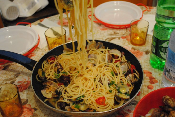 So here it is: spaghetti with clams, tomatoes and this indescribably delicious sauce. Believe it or not, before coming to Italy I was a bit nervous about the whole shellfish scene. I used to look at them with distrust, because lets face it, we’ve all heard of a nightmare food poisoning story involving Great Yarmouth and some dodgy cockles. So, I ate my first mouthful with trepidation, however as soon as I tasted that saltiness combined with the warmth of the pasta and the depth of the sauce I simply fell in love. And it doesn’t stop there, after finishing my pasta another saucepan filled with elegant, ebony mussels appeared on the table. Swimming in a salty, buttery sauce they were completely out of this world. Of course, the whole meal was finished off with perfectly dressed salad and mossarella and fresh fruit for dessert: heaven, heaven, heaven.