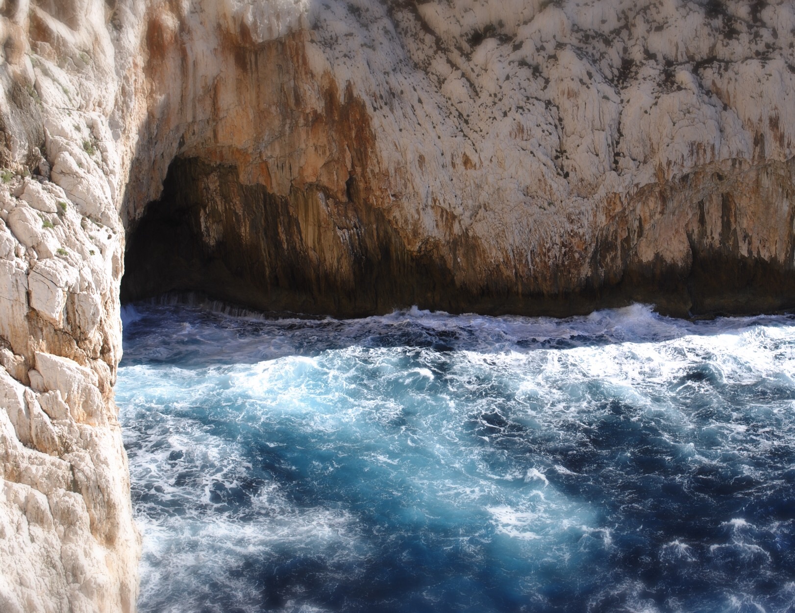 But there are steps. They cling to the cliff edge, gradually descending into the sea. We follow them, not quite knowing what we’ll find at the bottom. It’s not until they curl inside the mouth of a cave that we realise we’ve stumbled upon Neptune’s Grotto – one of the most renown stalactite caves on the island.