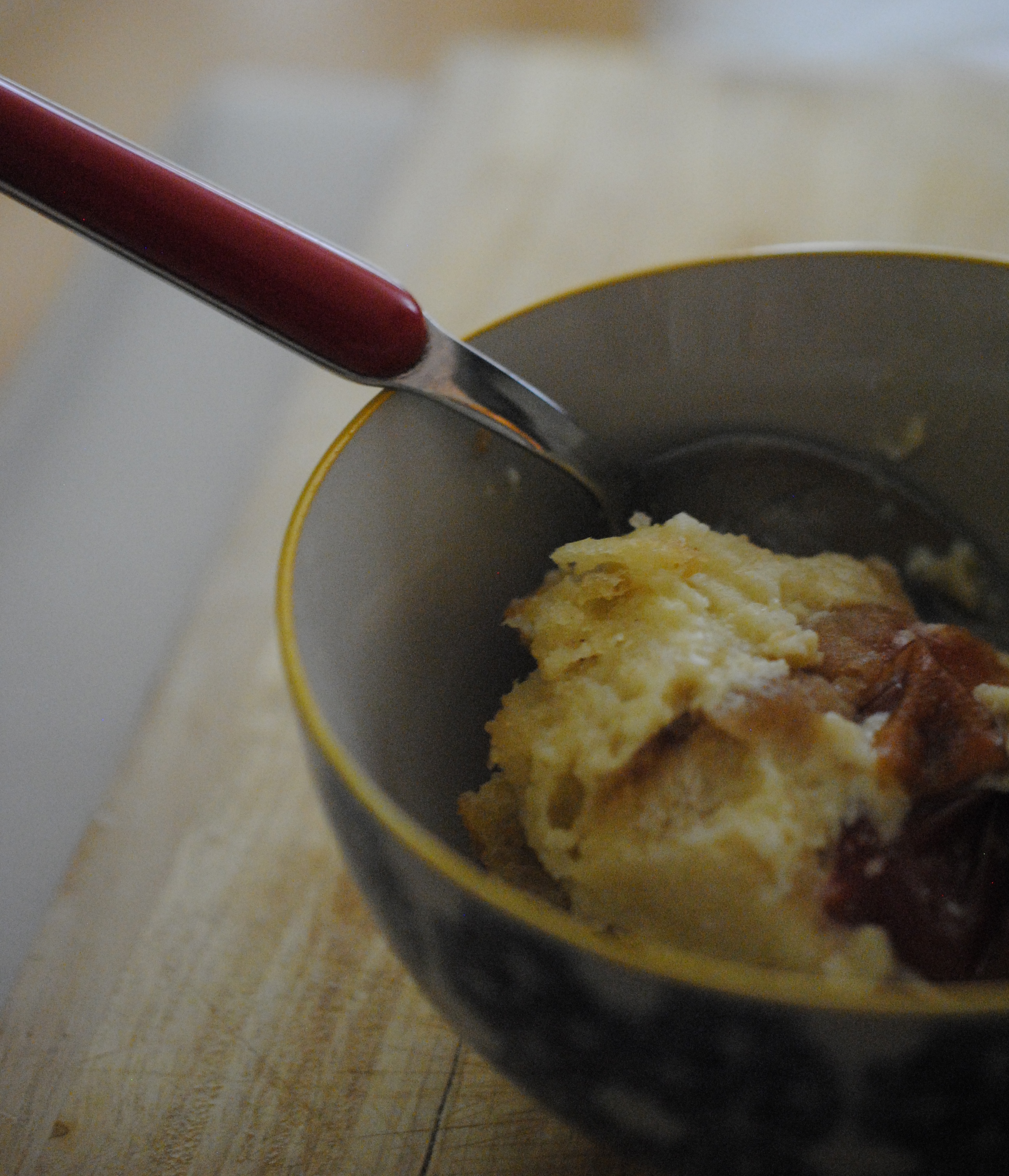 Here is a recipe I adapted from Delia. I had some plums that needed using, so traded those in for the raisins. Lined up on the bottom of the dish, they create a deliciously tangy note against the pudding.