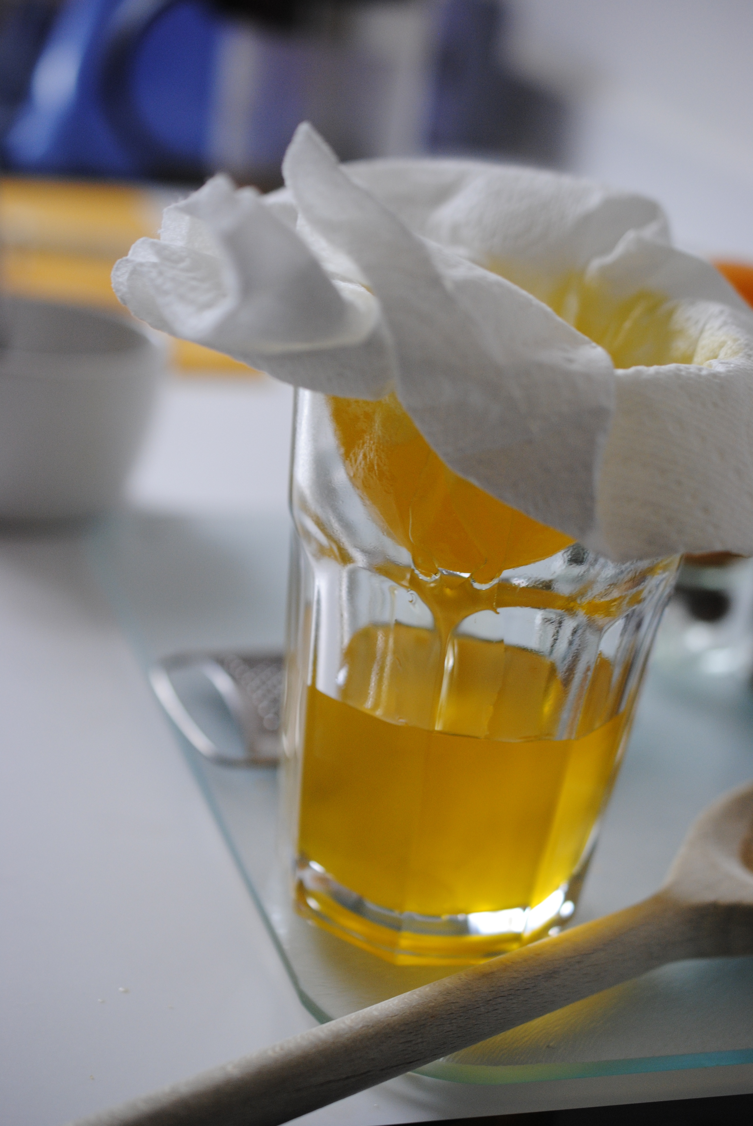 Line the top of a glass or jug with a double layer of kitchen roll (or muslin cloth if you happen to own some). Now it’s time to clarify the butter. Gradually pour the molten liquid into the glass, allowing the filtered butter to drip through the sodden kitchen towel. Before long you’ll have a glass of golden clarified butter.