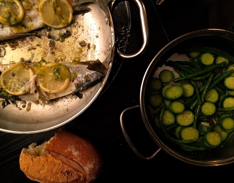 I come to you this evening with possibly the simplest fish recipe in the world. In fact, it’s barely a recipe – more a gentle reminder of something we all know: that lemon, parsley and fresh fish are three things that almost always come together to create something wonderful. And I’m talking about really fresh fish here. This branzino came from the Rialto Fish Market, bought and eaten on the same day.